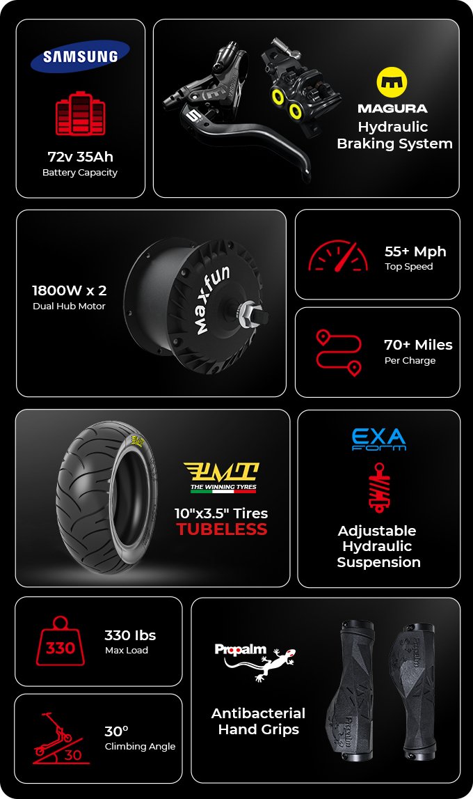 The Maxfun 10 MAX features a 72V, 35Ah removable Samsung battery, offering riders an impressive range of up to 70 miles. The 2520Wh large-capacity lithium battery delivers steady power output. It only takes 7 hours to fully charge with a 420W high-power adapter.