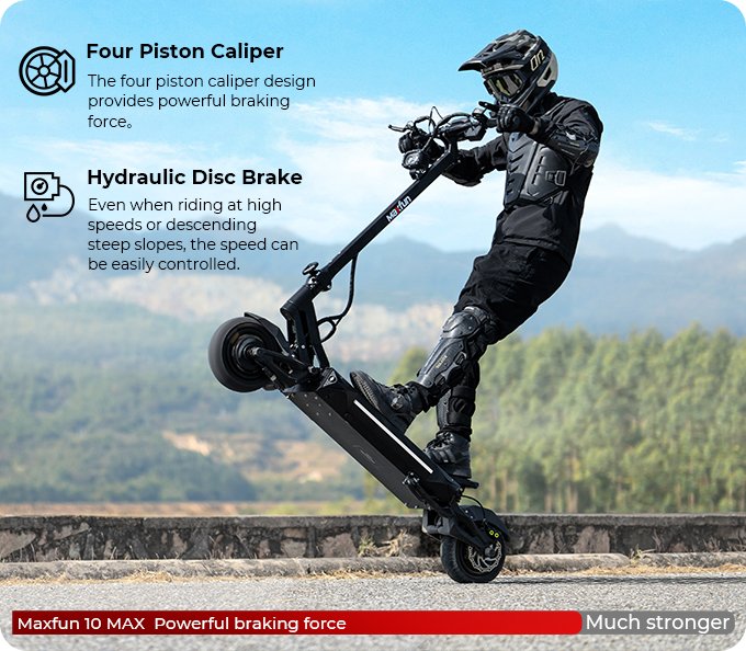 EXA FORM, As a leading shock absorption technology in the industry, the Maxfun 10 MAX electric scooter has become the core highlight with its excellent adjustment performance and durability. Whether shuttling through busy city streets or challenging rugged country roads, the EXA FORM adjustable shock absorber can precisely adjust the shock absorption force according to your needs, ensuring that every trip is smooth as ever.