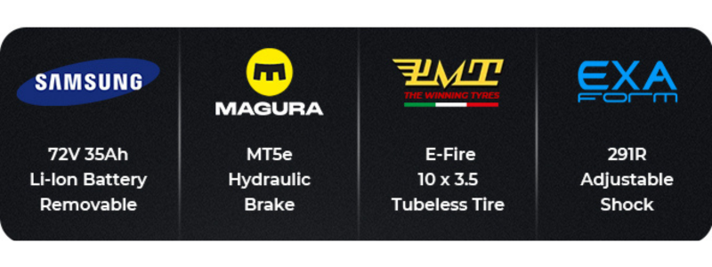 It is built for serious speed demons and long-distance urban adventurers. It’s not just fast—it’s engineered for total control, comfort, and raw power. The PMT 10×3.5 tubeless tires and Magura braking system ensure exceptional handling and safety, while the EXA FORM adjustable suspension system effectively absorbs road vibrations, providing a comfortable ride.